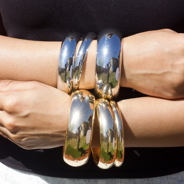 These Oversized bangles serve major runway energy. With a glossy mirror-like shine and bold rounded shape, they instantly transform any look—pair with sleek basics for a minimalist statement or stack both tones for a mixed-metal vibe.