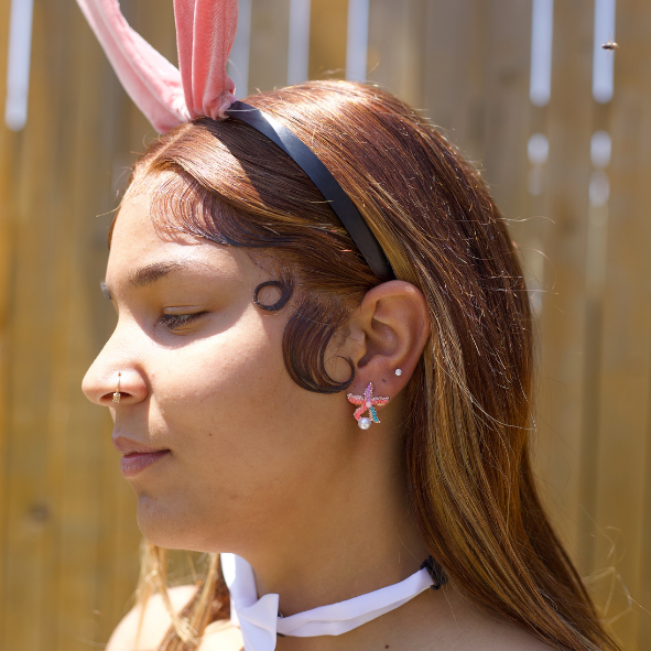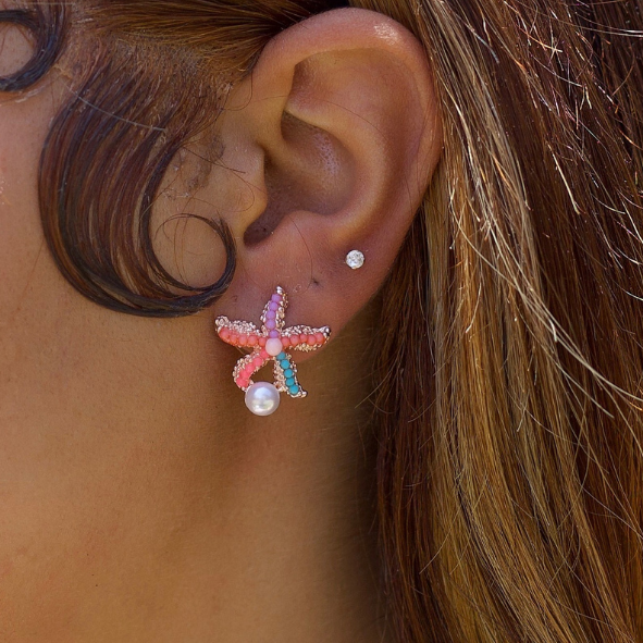 These starfish earrings add a whimsical, beach-glam vibe to any outfit. The delicate star silhouette is adorned with pastel beading and a glossy pearl drop that sways lightly with movement. Their petite size makes them ideal for everyday wear, while their vibrant colors make them a standout accessorizing piece for vacations, photoshoots, and warm-weather fits.