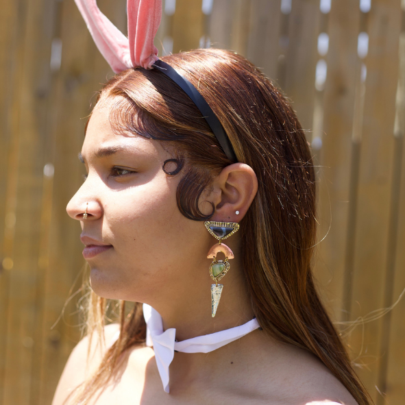 A wearable work of art. These handcrafted geometric earrings pair mixed shapes and natural-toned stones with distressed gold metal for a unique boho-luxury vibe. The tiered design adds movement and dimension, catching the light with every turn.