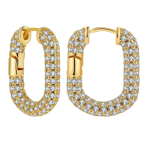 Turn heads with these sparkling oval link hoops, featuring a bold gold-tone base covered in shimmering stones for maximum shine. Designed with a polished clasp and modern elongated shape, these earrings bring a luxe statement to any look—from date night glam to upscale casual fits. Lightweight enough for extended wear, yet eye-catching enough to stand out, they’re the perfect balance of glam and sophistication.