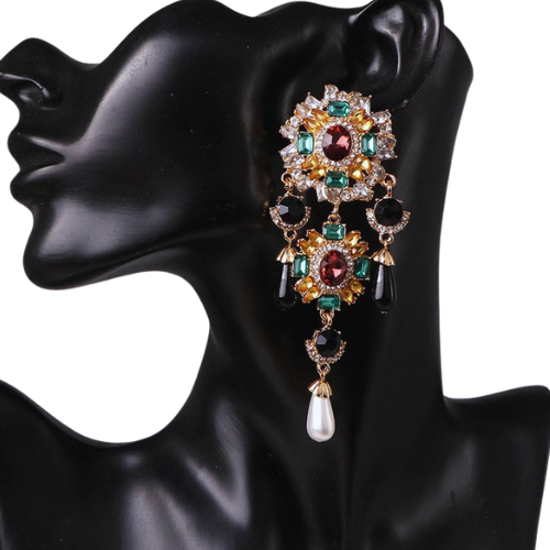 These stunning chandelier earrings are designed to captivate. Featuring an intricate arrangement of emerald, ruby, amber, and clear gemstones, each piece blooms with rich color and regal detail. Black teardrop crystals add dramatic depth, while the pearl drop at the bottom gives the perfect elegant finish. These earrings deliver couture-level glamour—ideal for events, photoshoots, or elevating any night-out look.