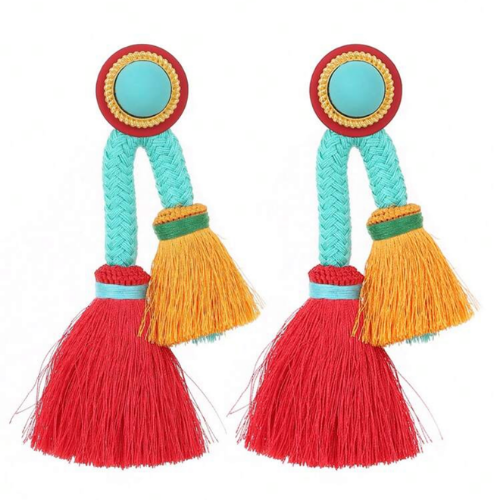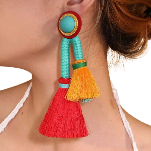 Bring playful energy and bold style to your look with our Fiesta Color Pop Tassel Earrings. Bursting with personality, these earrings feature a bright turquoise braided loop topped with a bold round stud, complete with layered orange and red tassels that create lively movement.
