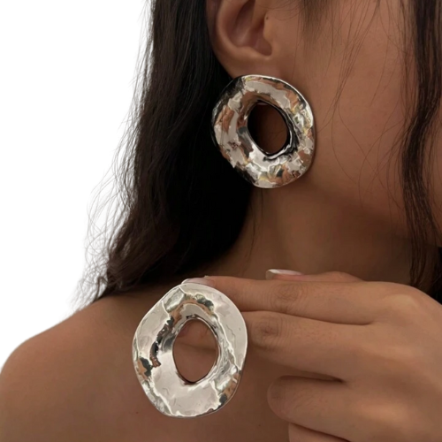 Make a bold, artful statement with our Sculpted Silver Organic Statement Earrings. Designed with an irregular, hand-formed silhouette, these earrings feature a modern open-center shape that looks effortlessly high-fashion. The textured, molten-metal finish creates depth and shine, catching the light beautifully from every angle.
