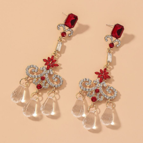 Stones: Deep ruby-red gemstone accents + Clear teardrop crystal dangles for added sparkle