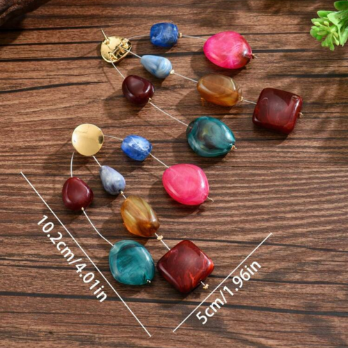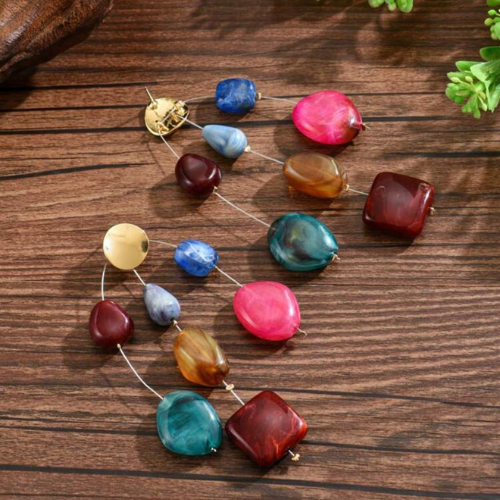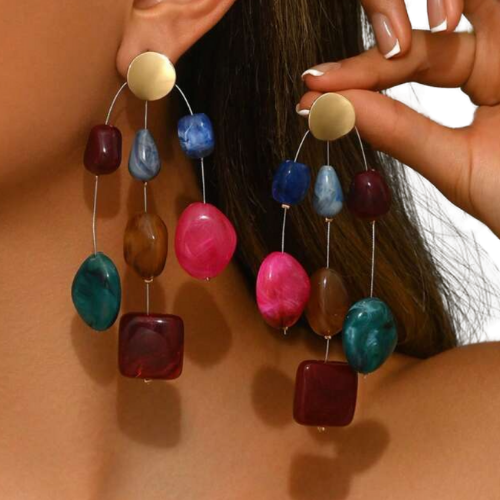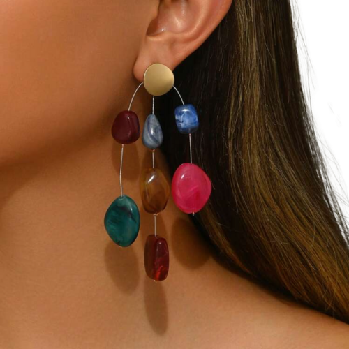 Bring color, movement, and modern artistry to your look with our Aurora Pebble Cascade Statement Earrings. Featuring a trio of sleek wire drops adorned with marbled resin stones, these earrings showcase a stunning blend of jewel tones—teal, ruby, pink, amber, and sapphire blue. Each stone is uniquely shaped, giving the earrings an organic, sculptural feel.