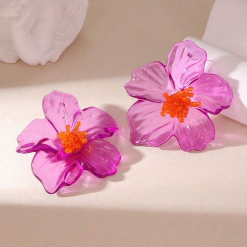Add a burst of island sunshine to your look with our Tropical Bloom Acrylic Flower Earrings. These hibiscus-inspired blooms are crafted from glossy, translucent acrylic that catches the light beautifully, giving each petal a radiant, glass-like glow. Finished with textured beaded centers, they bring the perfect blend of bold color and playful charm.