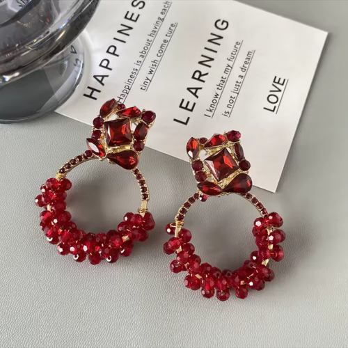 Bring luxurious sparkle to your look with our Royale Beaded Hoop Earrings. Designed to turn heads, these earrings feature a stunning top cluster of emerald-cut and teardrop gems in deep red tones, set in a rich gold frame. The beaded hoop below is wrapped in matching faceted red beads, adding texture, shine, and elegant movement with every step.
