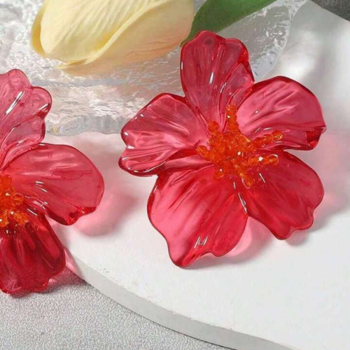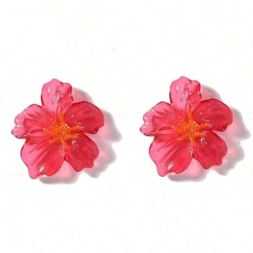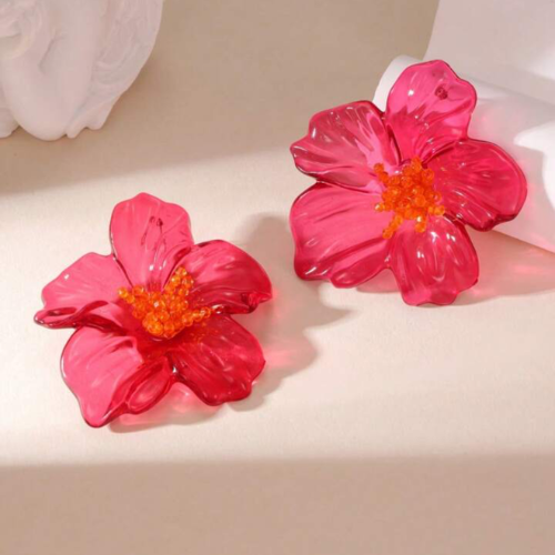 Add a burst of island sunshine to your look with our Tropical Bloom Acrylic Flower Earrings. These hibiscus-inspired blooms are crafted from glossy, translucent acrylic that catches the light beautifully, giving each petal a radiant, glass-like glow. Finished with textured beaded centers, they bring the perfect blend of bold color and playful charm.