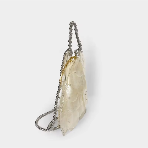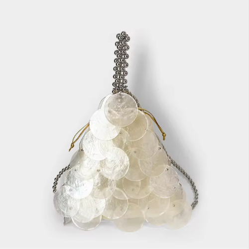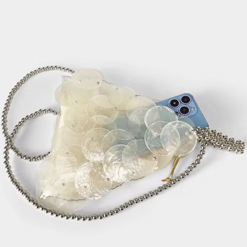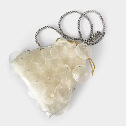 Make a shimmering statement with this shell-disc crossbody bag, designed with layered iridescent discs that catch the light from every angle. Its triangular silhouette gives it a bold, modern edge while the silver ball-chain strap adds glam and texture. Spacious enough to fit your phone and small essentials, this bag is perfect for festivals, vacations, beach dinners, and standout night-out looks.