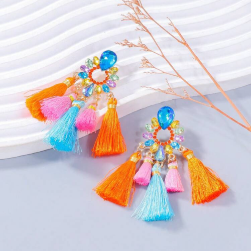 Turn every room into your runway with these playful, color-packed statement earrings. Designed with sparkling iridescent gems and multi-layer tassels in bright orange, pink, and aqua, they bring the perfect mix of fun, flair, and festival energy.